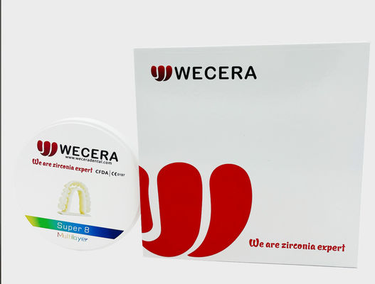 Wecera Super8, das mehrschichtiger Zirkoniumdioxid-Block von biologischem Nano-Zirkoniumdioxidpulver 100% von Tosoh mit kalter Fertigungstechnik Isostatic Drückens, es gemacht wird, ist das natürlichste Zirkoniumdioxid im Markt, es ändert Farbe, Stärke und Durchsichtigkeit allmählich von zervikalem zum schneidenden Teil bei einer Zirkoniumdioxiddiskette.